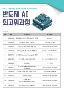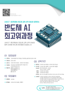 [안내] UNIST 반도체 AI 최고위과정 모집 안내 2026.01.02 안녕하세요, UNIST-용인특례시 반도체 교육산학허브에서 UNIST 반도체 AI 최고위 과정을 모집합니다. 신청기간: 2026.01.12(월) ~ 2026.02.20(금) 지원방법: hy0831@unist.ac.kr 지원서 메일 접수 많은 관심과 지원 부탁드립니다. 붙임: 홍보자료 및 반도체 AI 최고위 과정 입학지원서(개인정보활용동의서) Download 5기-입학지원서-및-개인정보활용동의서양식-1.hwp 홍보자료_제5기-반도체-AI-최고위-과정SLP-모집요강-재.pdf